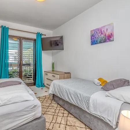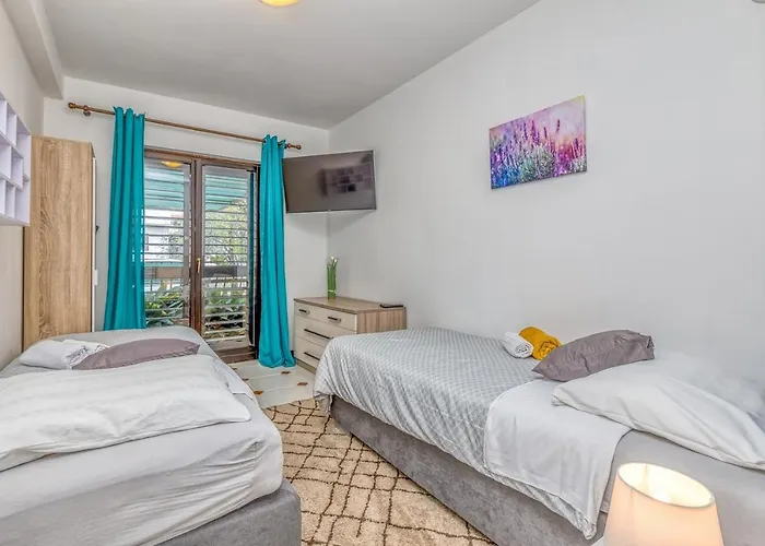 Pobliskie atrakcje to Športska dvorana Žatika, maksymalnie 1 km od apartamentu o powierzchni 100 m^2 oraz Park wodny Aquacolors Poreč - prawie 10 min autem stąd. Dotarcie do serca Poreču zajmie Ci 15 min.